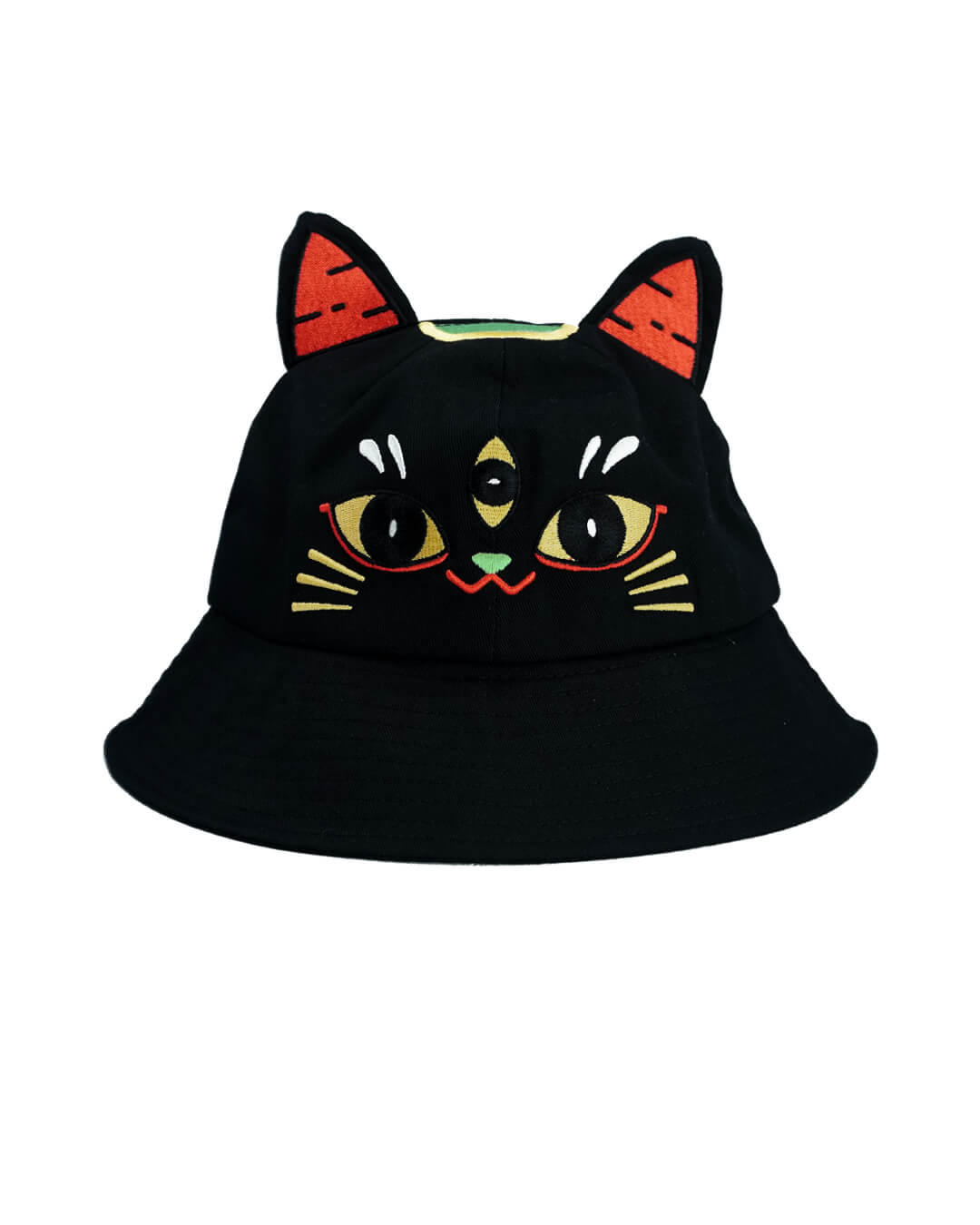 Original LUCKY CAT design embroidered on a 100% cotton black bucket hat with cat ears. Note: Actual product may differ from photo.