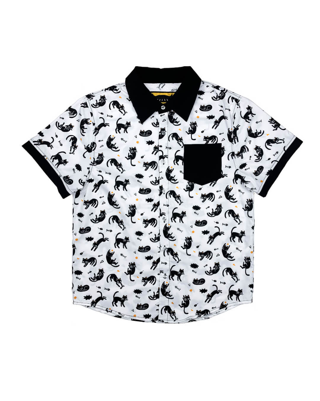 Original BLACK CAT design by KINWA printed on a 100% polyester UNISEX button-up short sleeve shirt.
