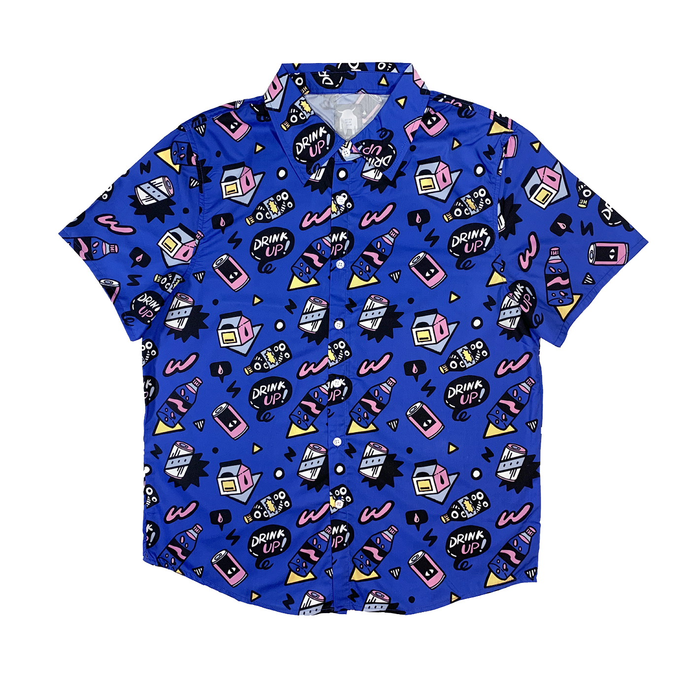 Original DRINK UP design by KINWA printed on a 100% polyester blue UNISEX button-up short sleeve shirt.