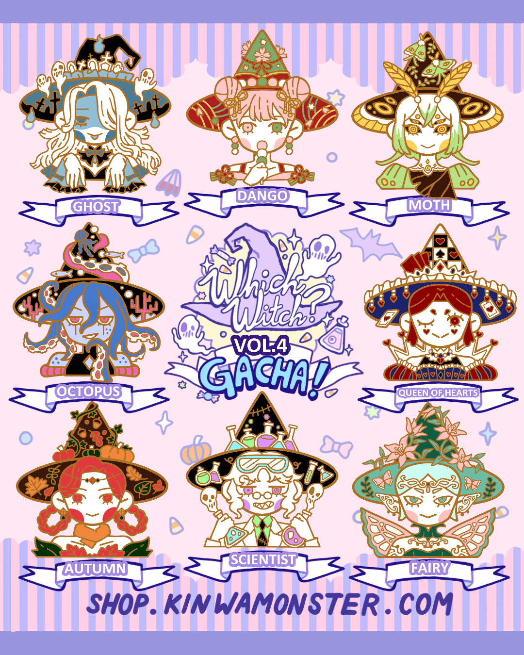 Try your gacha luck! Which witch will you get? This is VOL 4. of GACHA! series featuring eight 2.5 inch gold plated enamel pins with rubber backings! This is a LIMITED collection and will not be restocked if sold out! All 8 designs are now available to pull!