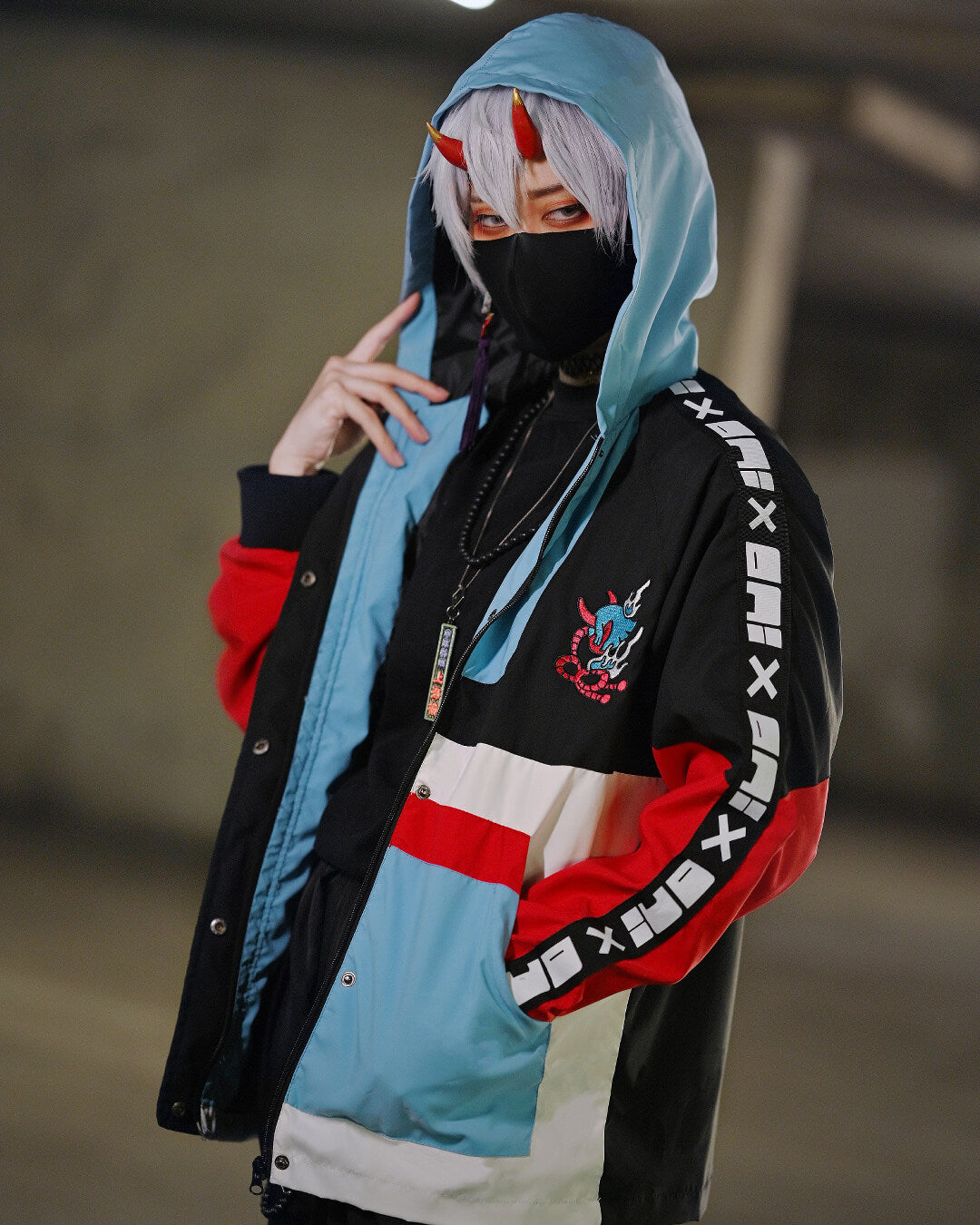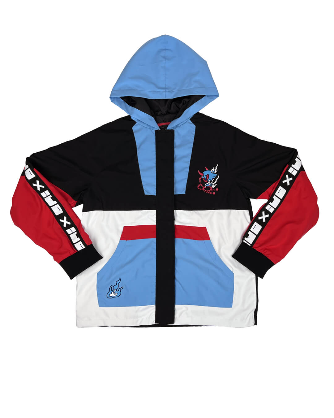 Original ONI GIRL design by KINWA silkscreened on a colorblock hooded windbreaker jacket. Features the Oni sisters on the backside as featured in the Which Witch Gacha and associated merchandise!
