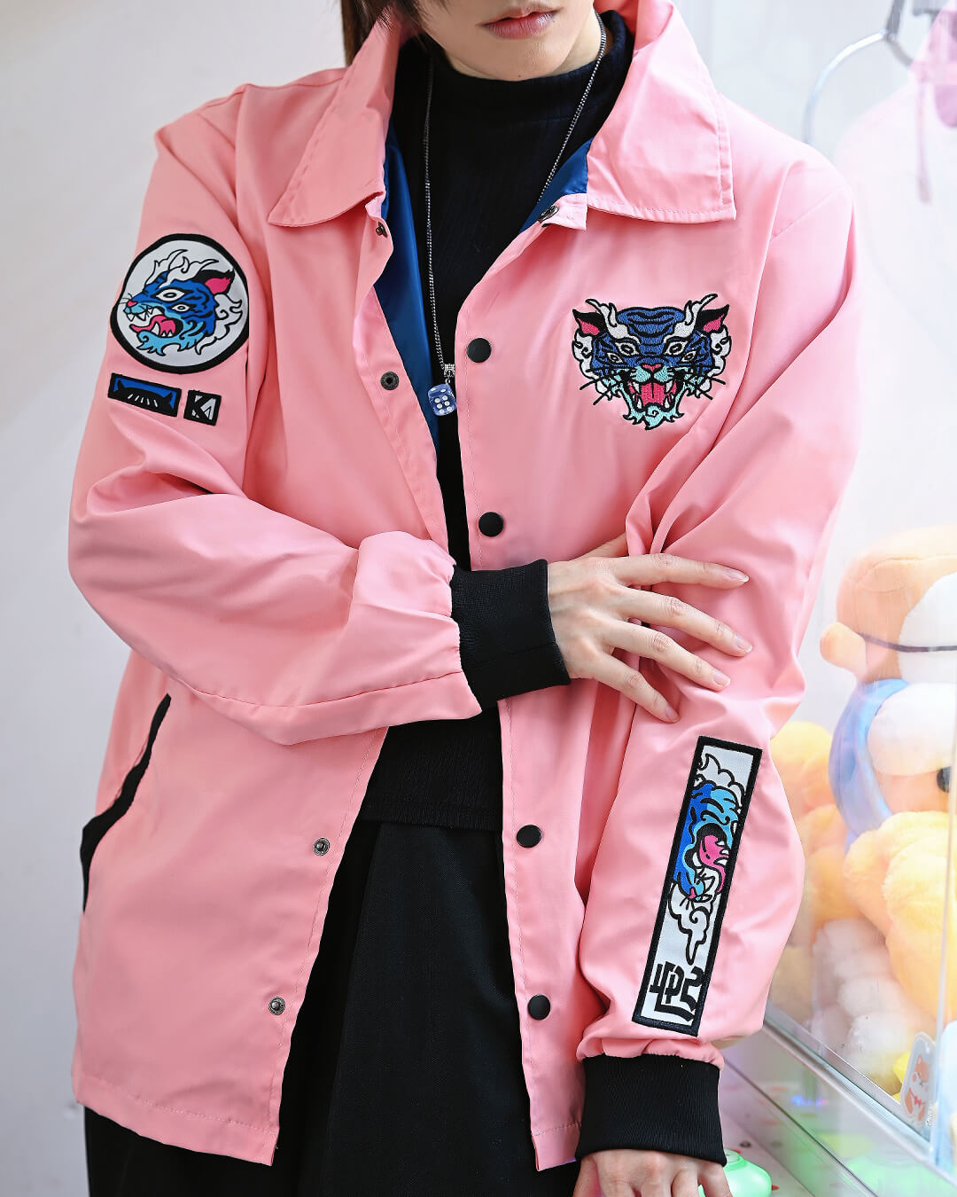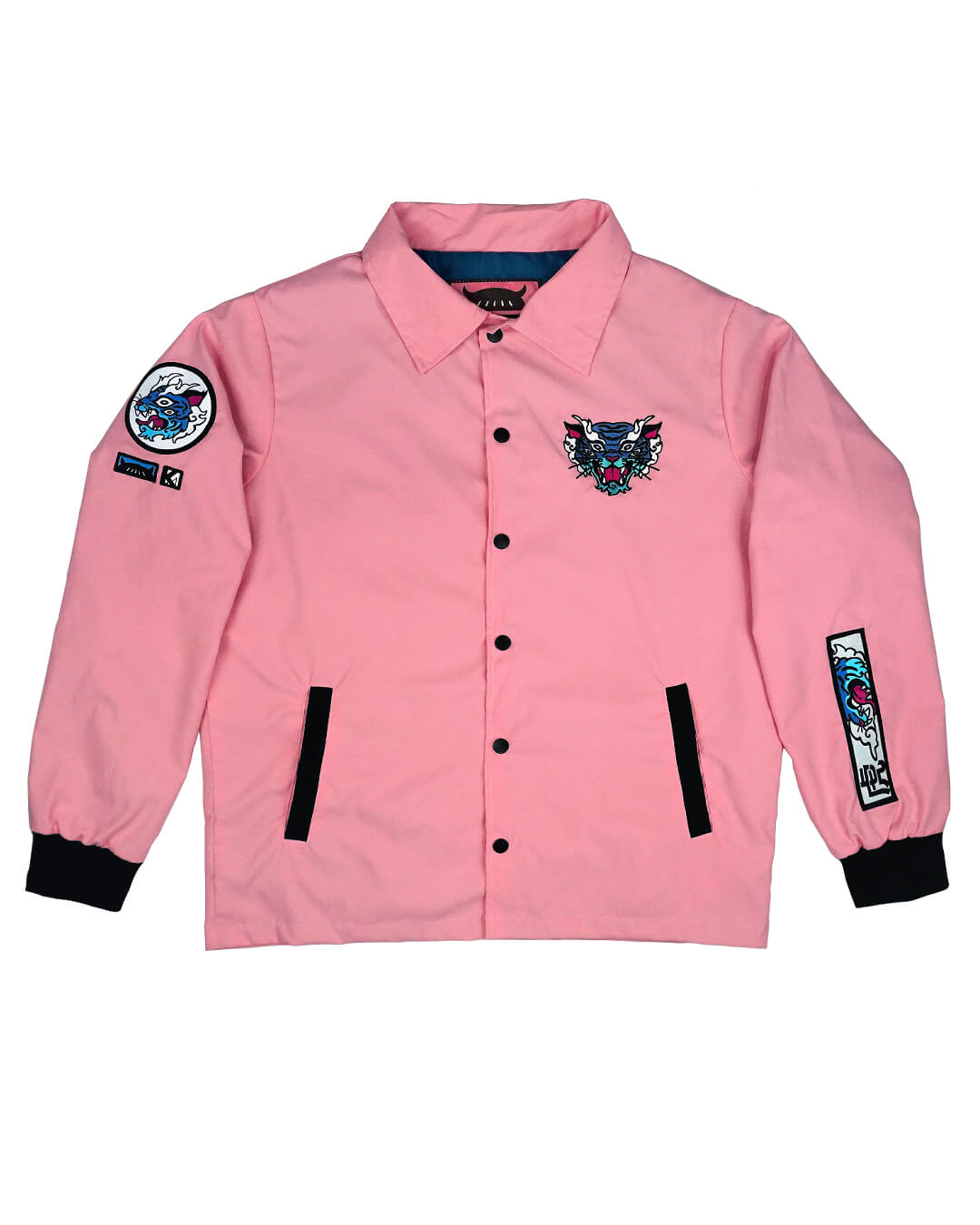 Original TIGER design by KINWA for LUNAR NEW YEAR 2022! Silkscreened on a pink 100% polyester windbreaker jacket. Comes embellished with TIGER embroidery patches.