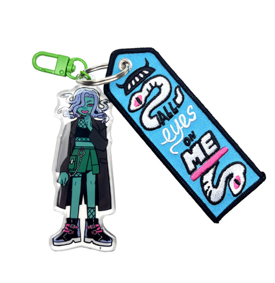 Approx. 3 inch (7.6 cm) clear acrylic resin keychain. Comes with matching embroidery strap.