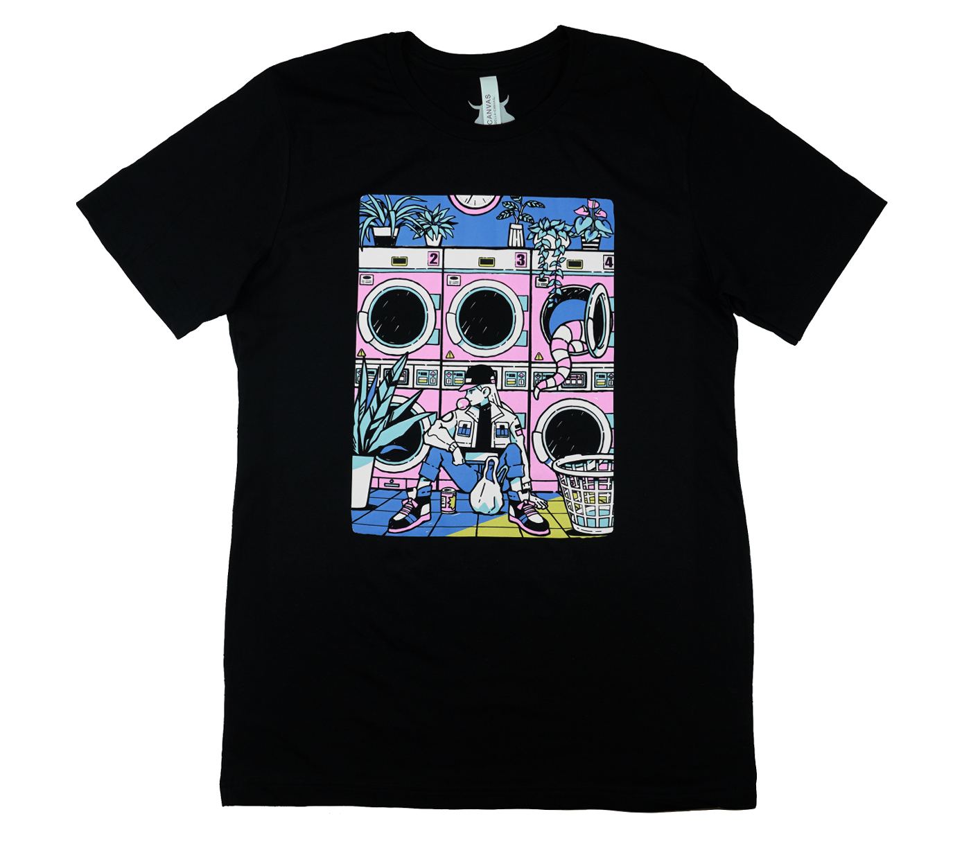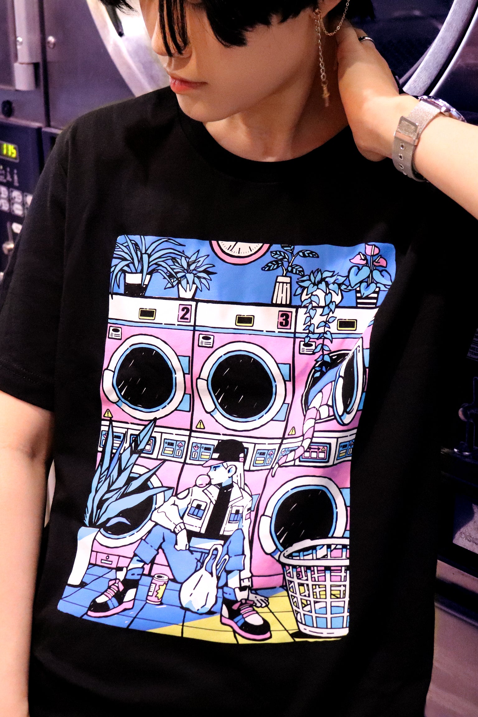 Original LAUNDROMAT design by KINWA printed on a 100% ring spun cotton UNISEX black t-shirt. Models are wearing medium and x-large.