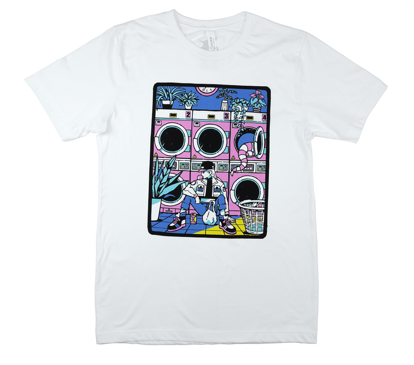 Original LAUNDROMAT design by KINWA printed on a 100% ring spun cotton UNISEX white t-shirt. Model is wearing a medium.