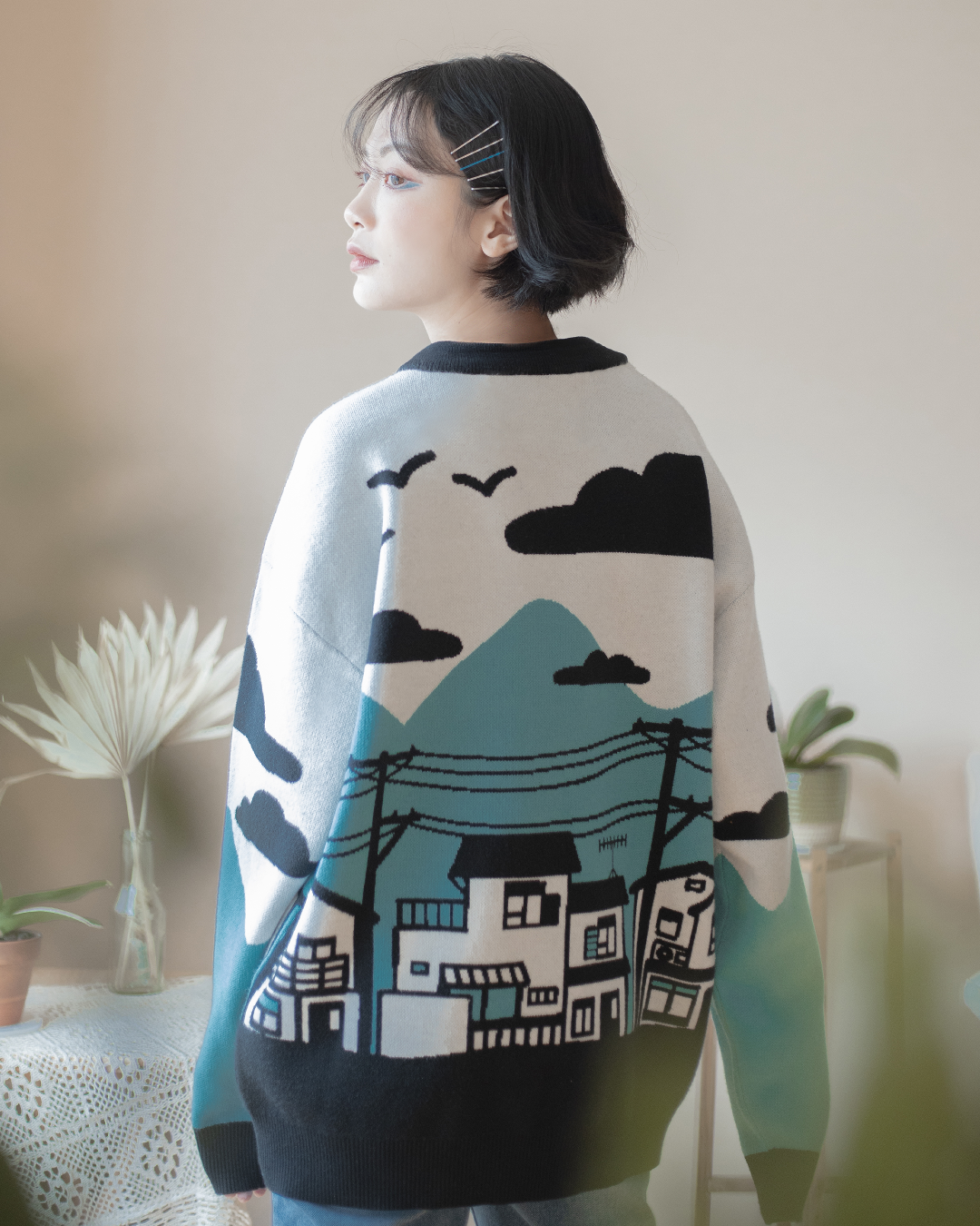 A wistful serene view of one's childhood neighborhood by the mountains. Lightweight Sweater! Model is 5'7'' and waring a medium!