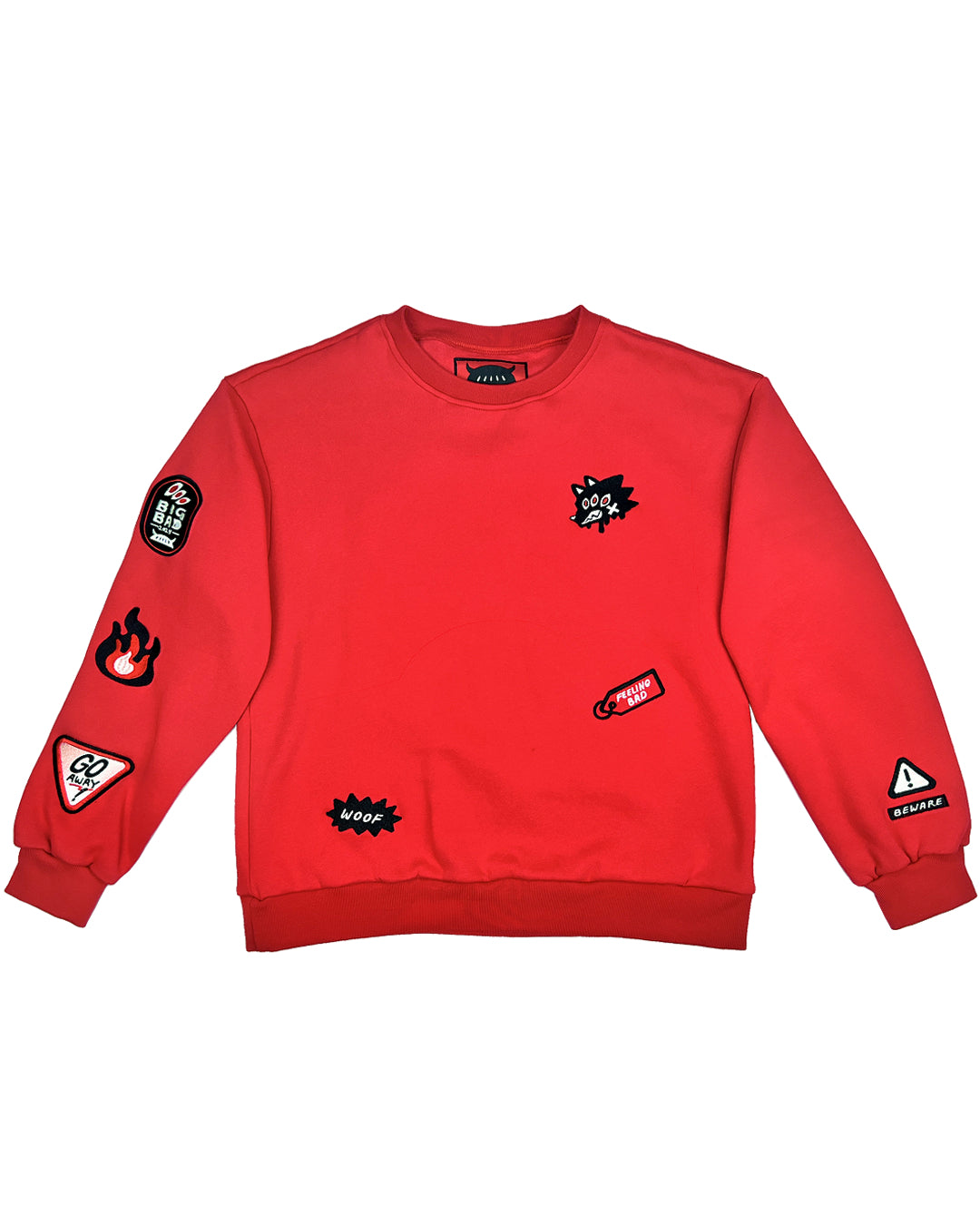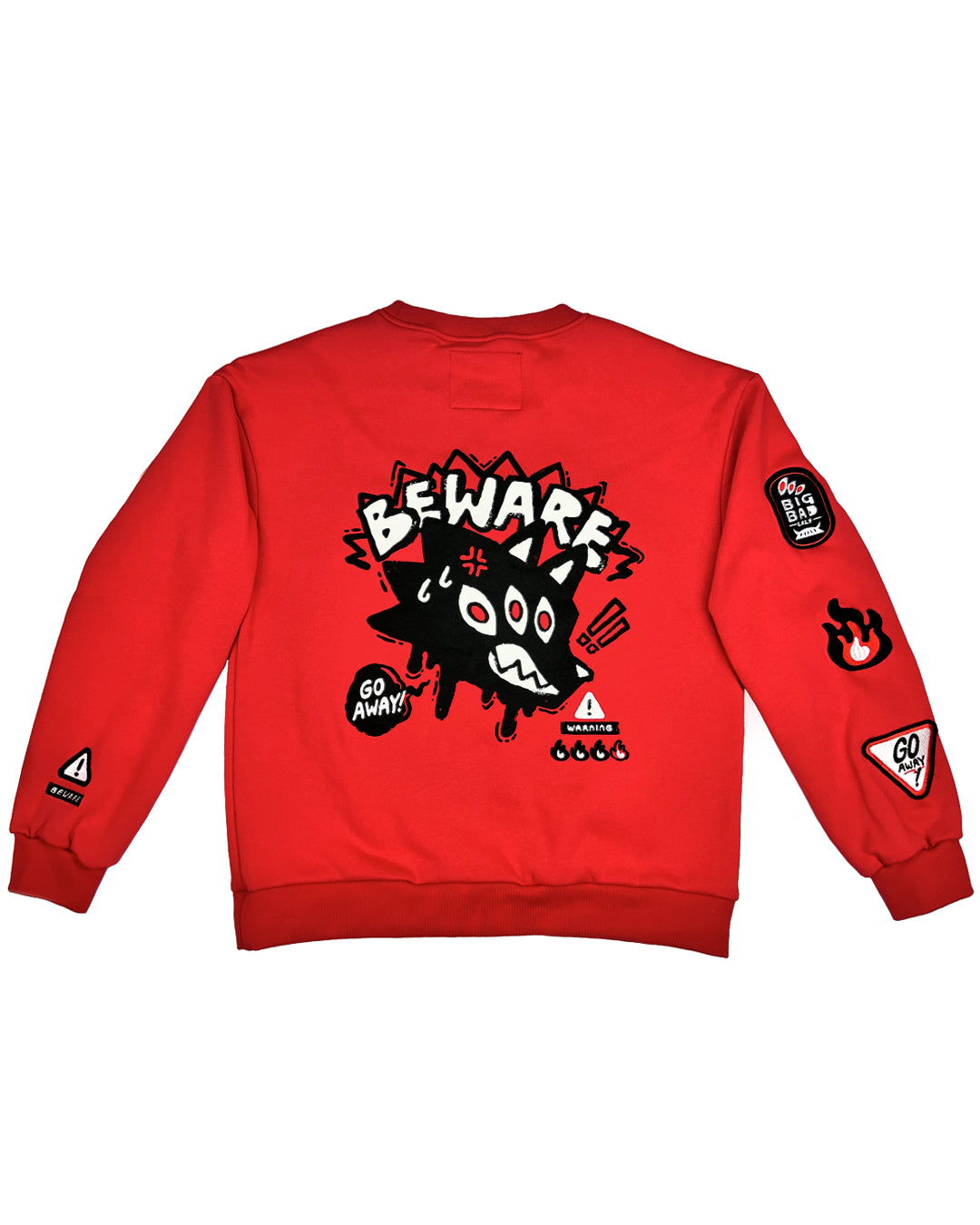 Original BIG BAD design by KINWA embroidered on a 50/50 cotton and polyester red sweatshirt. Distressed Silkscreen on the Backside. Interior Fleece lining.