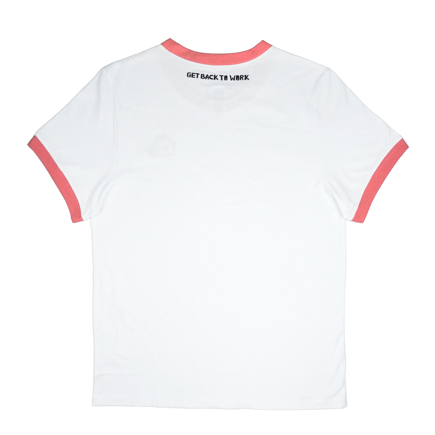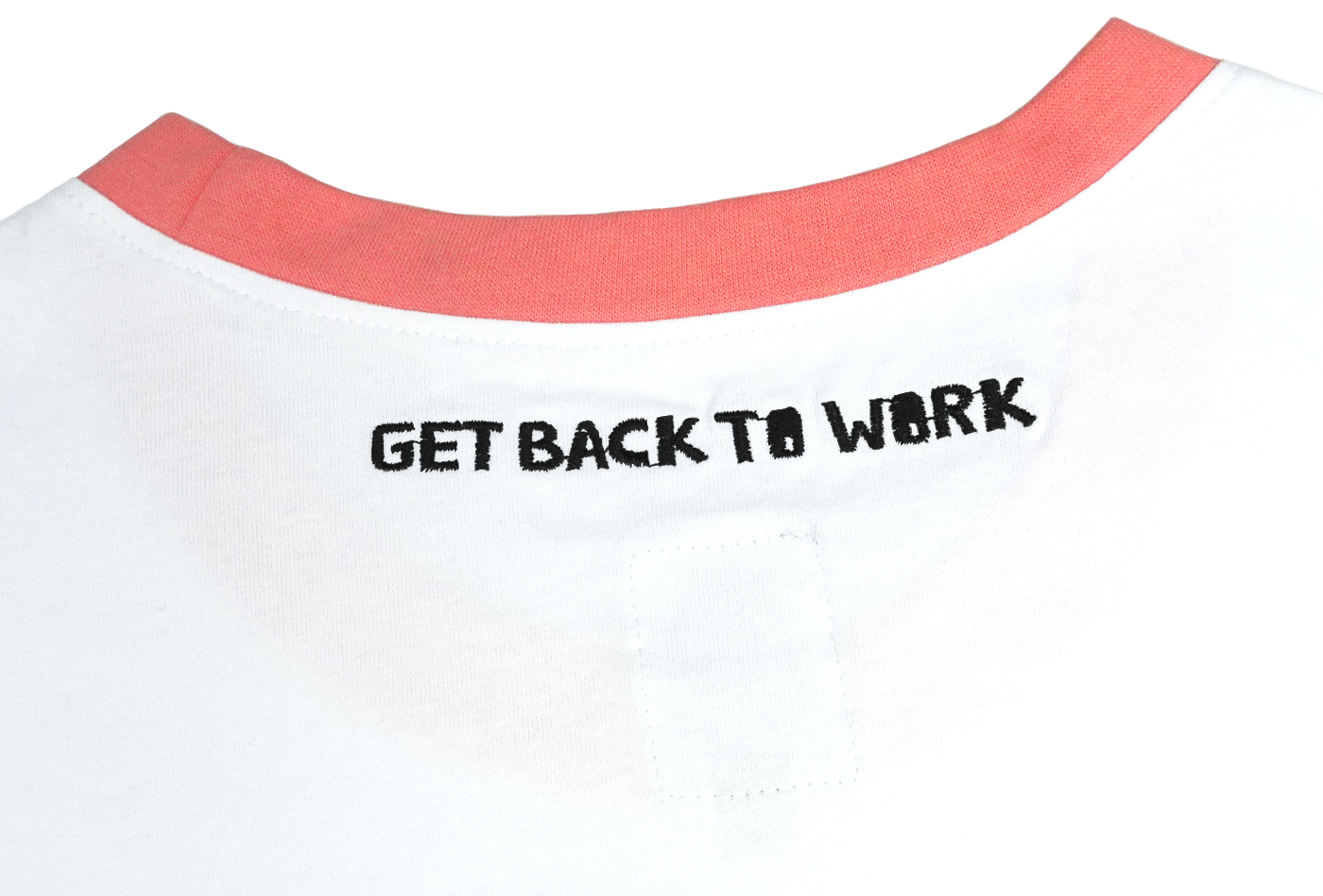 - Light Blue ribbed binding on neckline and sleeves, double needle neckline and bottom hem