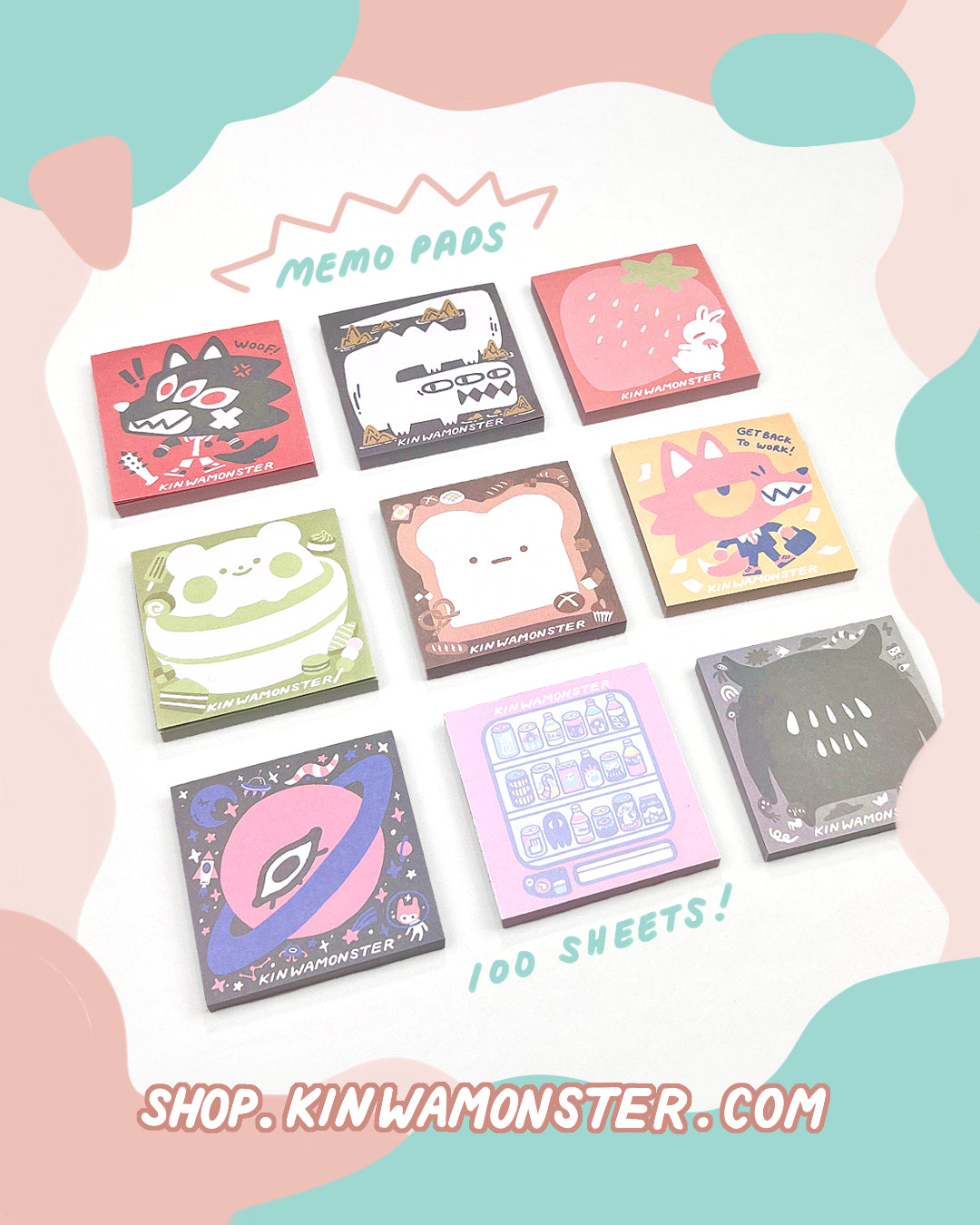 KINWAMONSTER square memopads featuring various original characters. Individually packaged! Great as gifts to your friends and loved ones!
