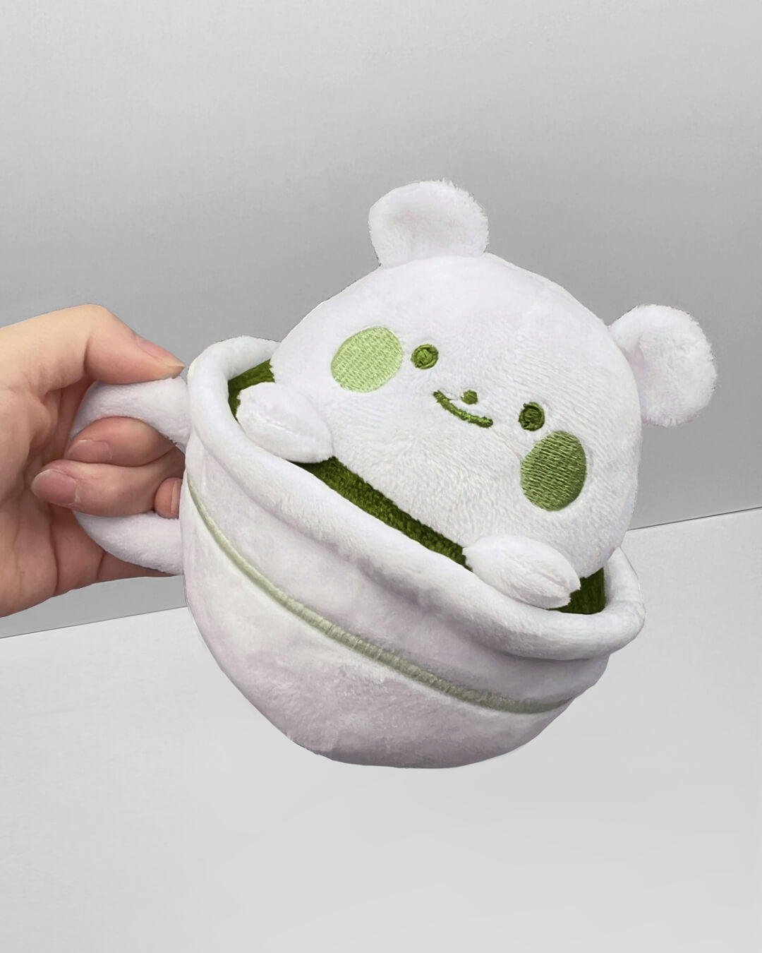 A nice warm travel-sized Matcha Bear latte plush toy! Take a long sip!
